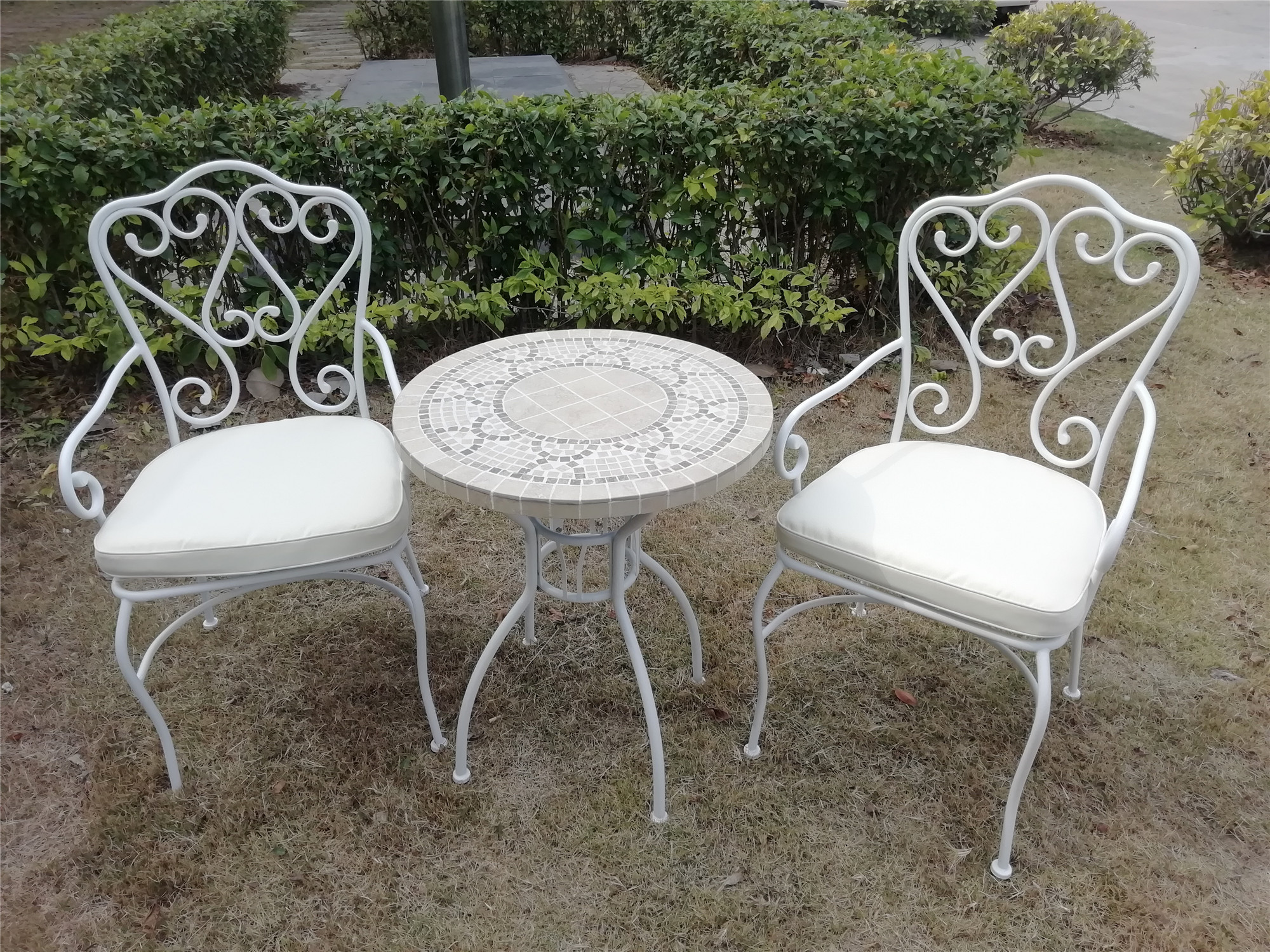 The natural elegent Ceramic mosaic table top with Wrought iron table leg. Wroight iron craft chair with waterproof cushion.